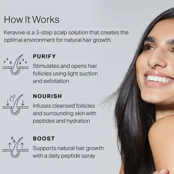 Keravive can improve overall scalp health. Poor scalp health can be a major contributor to damaged, thinning hair and inhibit the growth of healthy hair. Patients who suffer from scalp flaking, itchiness, dryness or irritation are great candidates for Keravive. Additionally, Keravive can help individuals who have hair thinning or loss due to hormonal, environmental, or physiological factors like stress, or are preparing for a hair transplant or undergoing hair loss treatments like Rogaine, Propecia, PRP, or Laser Therapy.